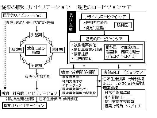 しかし、このシステムでは、患者である視覚障害者は医療から単に見放されたとしか受取れない患者も多く、悩み、苦しみ、果てはうつ状態となり、心療内科や精神科の治療を受けているものもいる。したがって、日常生活訓練を求め、盲学校や福祉の戸を叩くものは少なかった。これではいけないと最近の眼科医療では、眼を診て失明が予想できたり、視覚的困難の訴えがあったなら、たとえ治療中であってもロービジョンケア(訓練)を開始している。そこでは患者や視覚障害者の苦しみや悩みを感じる心が最も重要で、したがって我々、医療人がまず自らの感性を磨くことに努めなければならない。患者や視覚障害者の方々の声を真摯に受け止め、また擬似体験などが感性を磨くことに大いに役立つ。診断・治療を受けた後にどのように生活すればよいか、どのように勉強すればよいのか、どのように仕事をすればよいかを患者や視覚障害者は求めている。これに答えるのがロービジョンケアである。そのためには他科の医師やリハスタッフなど医療内の連携は当然のことで、医療と福祉などを並列に考える患者指導の医療を展開すべきである。
